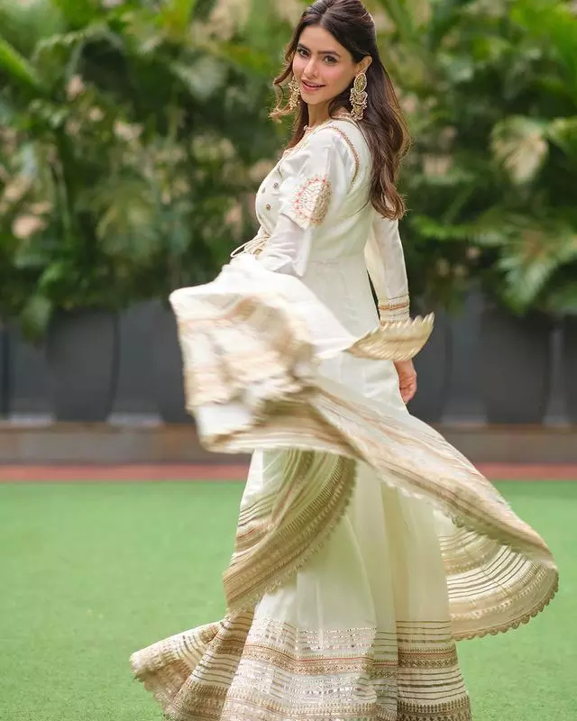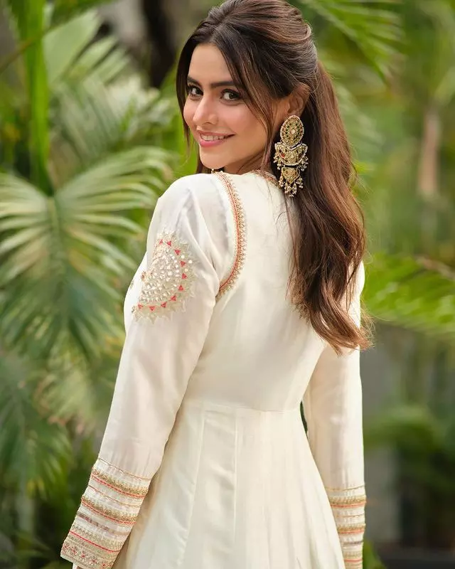 In these latest snapshots, Aamna Sharif looked stunning in a traditional tussar white Anarkali set. Her attire was complemented by long jhumkas that added a touch of elegance to her appearance. What made the ensemble stand out even more was her stylish hairstyle, an adorable smile, and her poised poses.