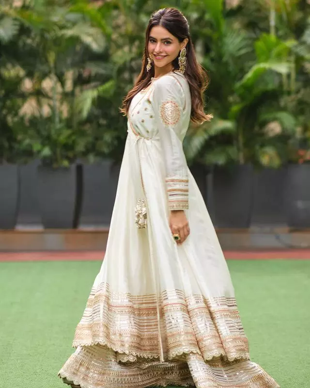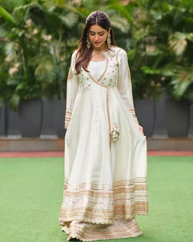 Aamna Sharif looked stunning in a traditional tussar white Anarkali set. Her attire was complemented by long jhumkas that added a touch of elegance to her appearance.