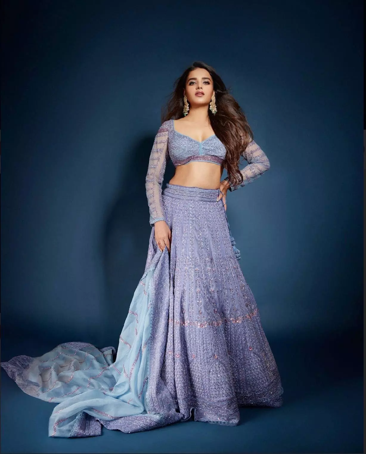 Known for her stunning appearances, Nidhhi has a knack for grabbing attention effortlessly. Recently, she made heads turn in a chic lavender lehenga paired with a sky-blue dupatta. Her attire showcased her elegant silhouette, captivating onlookers and leaving a lasting impression.