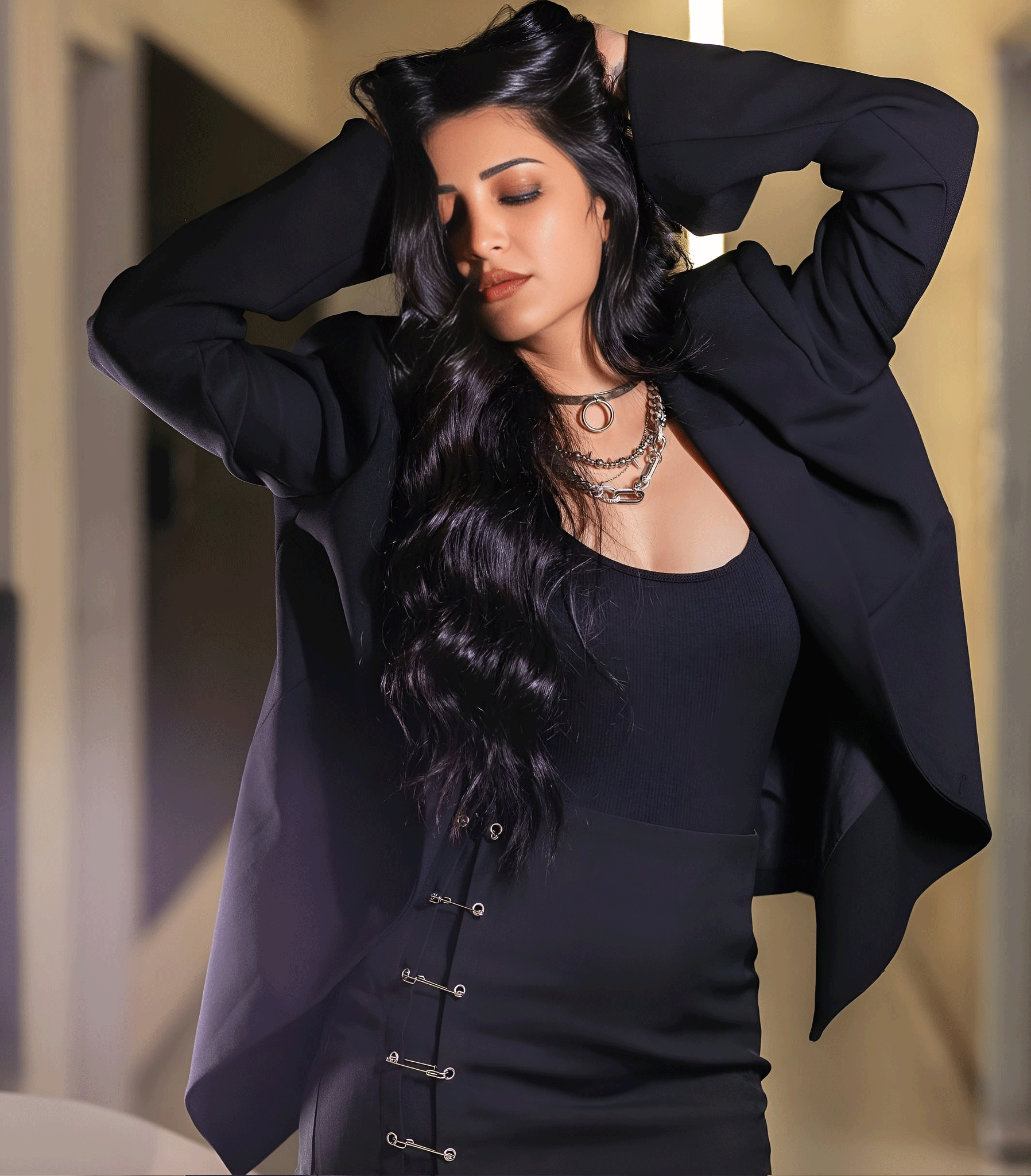 Beyond her on-screen success, Sruthi Haasan's Instagram has become a hit among fans, especially with her recent pictures. In a black mini dress elegantly paired with a matching jacket, she emitted an aura of sophistication. Complementing her attire, she accessorized with a silver chain and ring, creating a stylish ensemble that captivated her followers.