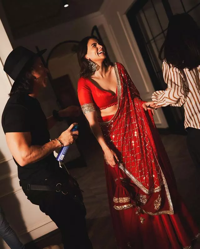 Alia Bhatt, in particular, stole the spotlight with her stunning appearance that set social media abuzz. She adorned herself in a resplendent red lehenga complemented by a net designer dupatta. Her choice of long jhumkas added a touch of traditional grace, while her free-flowing hair and radiant makeup accentuated her natural beauty, creating a mesmerizing look that mesmerized onlookers.