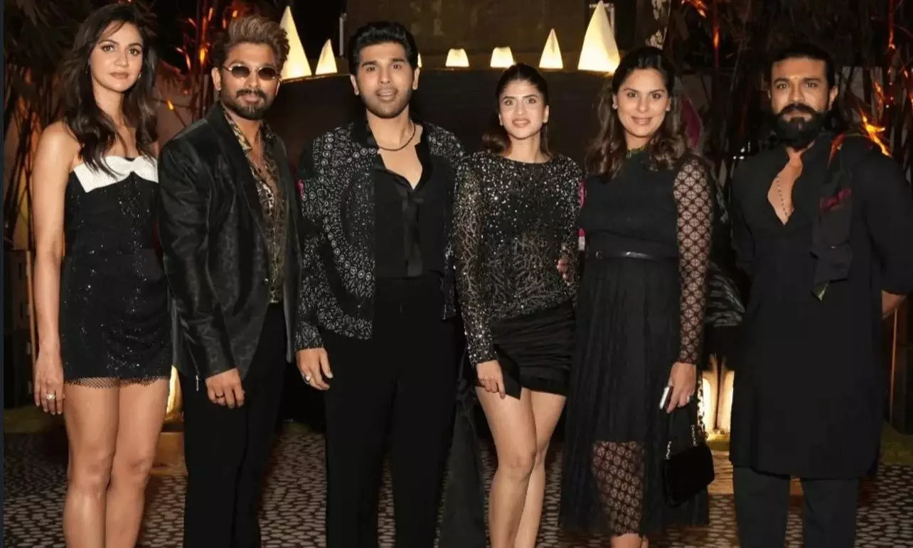 Especially with RRR star Ram Charan and his wife, Apollo heiress Upasana Kamineni, turning up, the party has got more glow than ever. While Allu Arjun turned up in animal printed suit and shirt, his wife Sneha Reddy stunned in a mini dress and white footwear. At the same time, Allu Sirish and Nayanika, standing in the centre, also commanded attention with their dazzling stone-studded outfits.