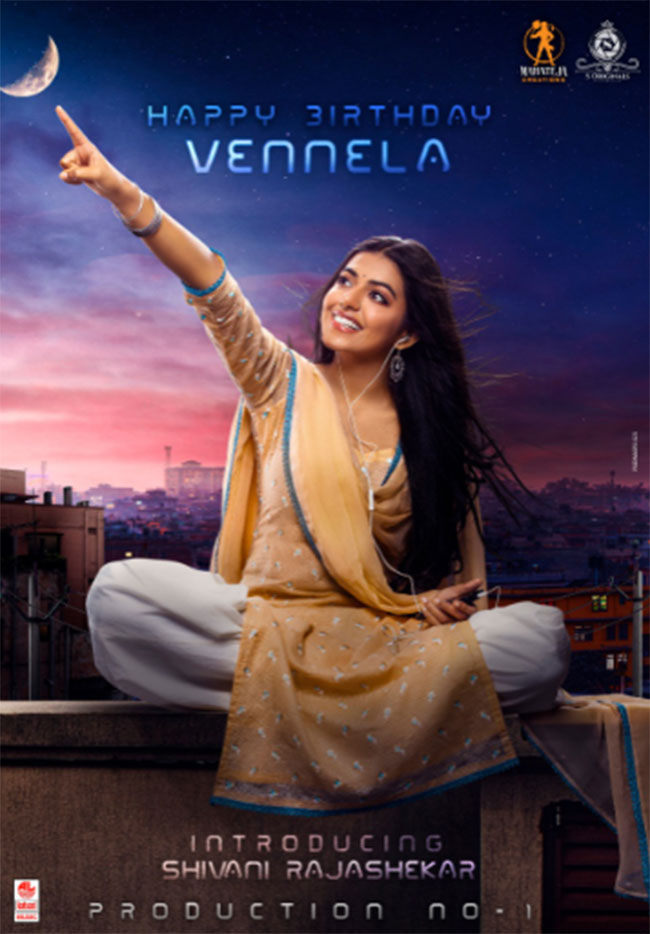 It is Shivani's turn to entertain the audience with the first film which is untitled for now. Her character's name is 'Vennela' in this movie and Shivani looks beautiful in the poster. She is seen sitting on the roof and pointing her finger towards the moon. Dressed in a churidar, Shiva looks like a happy-go-lucky girl who is enjoying the music.