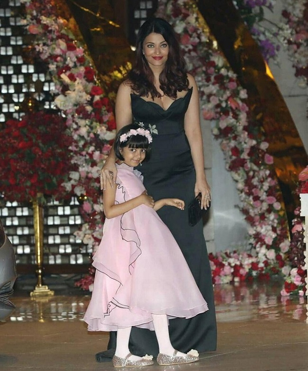 Reliance Industry Owner Mukesh Ambani's elder son is getting married. Diamond businessman Russels Mehta younger daughter Sloka Mehta is soon to be the daughter-in-law of Ambanis by getting married to Aakash. Both families had a threw a dinner party in Goa. Bollywood star cast also graced the event. Katrina Kaif and Shahrukh Khan became the centre of attraction. The other special attraction in the party is the Bachchan ladies. Aishwarya Rai Bachchan and her daughter Aradhya Bachchan appeared with stylish looks. Aish still looks like a 25-year-old woman. With her half shoulder black dress, revealing her cleavage beauty, Ash looked modern. Her loving daughter Aaradhya also looked adorable and dominated her mother with her cuteness.