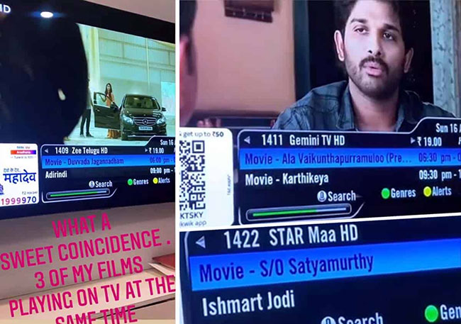Allu Arjun noticed it and took photos of all the three films being displayed on his screen. He shared his happiness by posting them on social media and writing, "what a sweet coincidence. 3 of my films playing on TV at the same time."