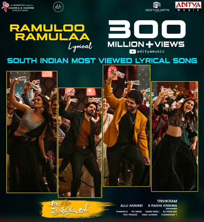 Even before the release, the film got a huge response with lyrical songs. Mass beat "Ramulo Ramula" is one such song that created magic on youtube. Now, this lyrical song has received the first-ever sensational record in South India. The lyrical video of Ramulo Ramula touched 300 million views on Youtube. This is the first ever song from South India to achieve this feat.