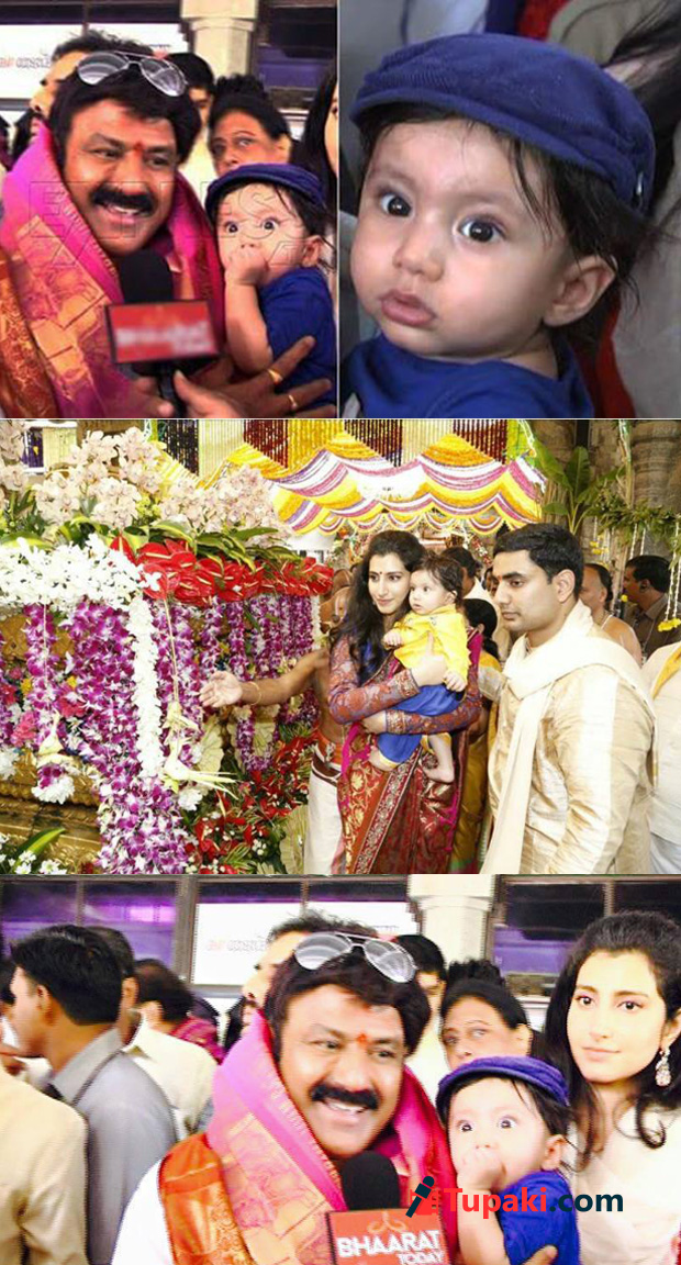 By: Tupaki Desk | 18 Oct 2015 2:58 PM ISTYuvaratna Balakrishna is now a happy grand pa. His daughter Nara Brahmani and and CM Chandrababu's son Nara Lokesh are proud parents for a cute kid Devansh.The cutekidâs Anna Prasana event was conducted in Tirumaal today.TTD officials accorded a grand welcome to Chandrababu and family