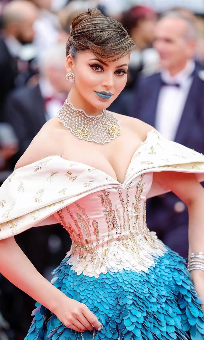 She may not be able to become a star heroine but the beauty queen surely knows how to turn people's heads towards her. Urvashi turned up at Cannes Film Festival and walked on the red carpet in several interesting outfits. Her recent appearance became the talk of the town as she walked in a white and blue outfit where she put on blue lipstick to match her dress.