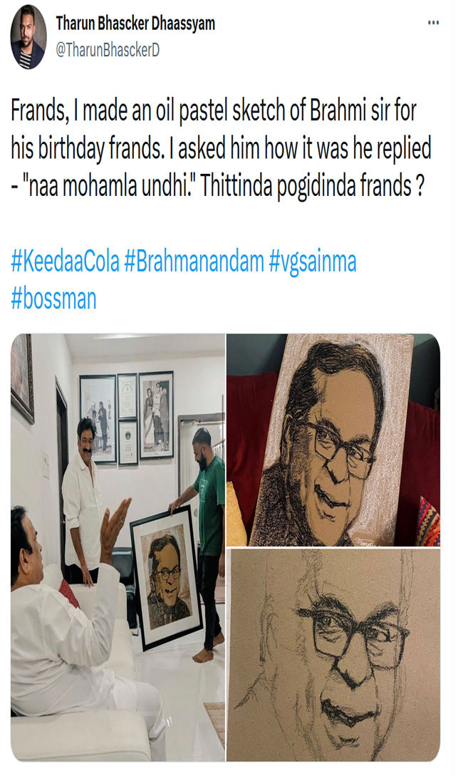 The 'Pelli Choopulu' director took to social media and posted a few clicks of the gift he gave for the comedy king. He wrote, "Frands, I made an oil pastel sketch of Brahmi sir for his birthday frands. I asked him how it was he replied - "naa mohamla undhi." Thittinda pogidinda frands?" The response from Brahmi is truly hilarious yet confusing at the same time. What do you think Brahmanandam meant?