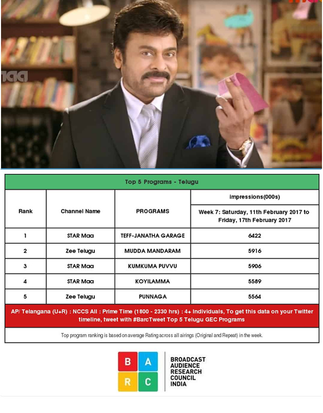 As per the latest BARC Ratings, 'Janatha Garage' fetched the best TRP last week. The next four spots were occupied by TV Serials.