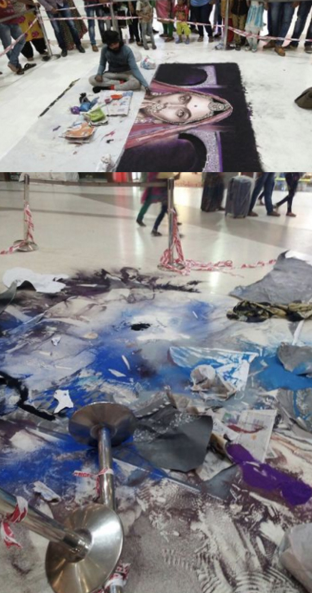 Artist Karan worked for 48 hours to create rangoli at a mall in Surat. All of a sudden, A crowd of 100 people stormed into the mall while raising the slogans of Jai Sri Ram and destroyed it completely.