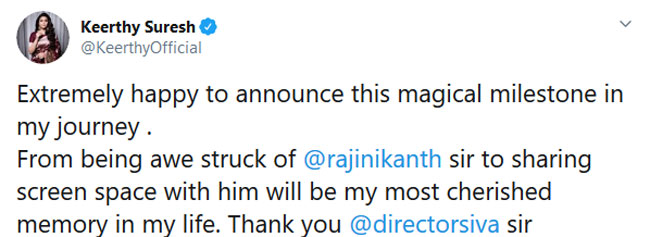 There were a lot of rumours about Keerthy being the lead actress in Superstar Rajnikanth's next film with Siva. Confirming them, she took to Twitter and shared her happiness by posting, "Extremely happy to announce this magical milestone in my journey. from being awestruck of @rajinikanth sir to sharing screen space with him will be my most cherished memory in my life. Thank you @directorsiva sir @sunpictures Thalaivar168." This is surely great news to hear and talented actress Jyothika is also playing another lead role in this flick.