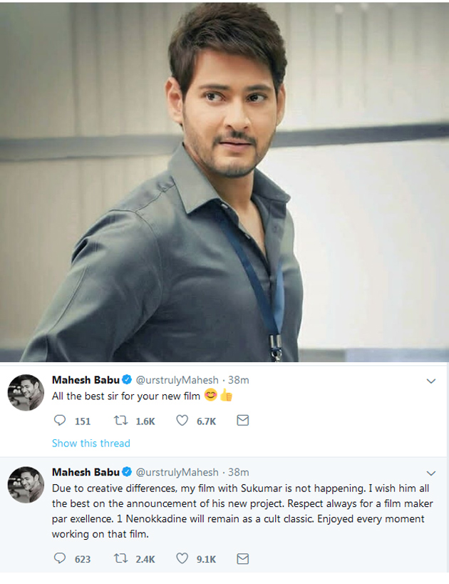 Mahesh Babu informed that the film he was supposed to do with Sukumar hasn't materialised due to creative differences. He, however, wished the Ace Director all the best for the new project with Stylish Star.