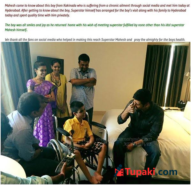 By: Tupaki Desk | 20 Aug 2015 9:52 AM ISTA boy who is suffering from a chronic ailment expressed his wish to meet his favorite star Mahesh Babu. Mahesh Babu came to know about it through the Social Media. Immediately, He made arrangements to bring the boy and his family to Hyderabad from Kakinada and spent some of his precious time with him privately. Mahesh interacted with the boy for sometime and inquired with his family about his health condition. He only wished the kid recovers completely to lead a normal life.