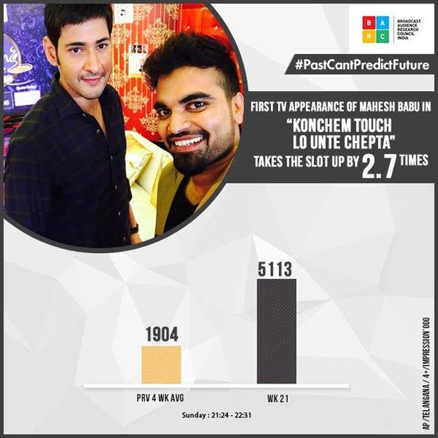 By: Tupaki Desk | 8 Jun 2016 12:44 PM ISTMahesh Babu appearing for the first time in a talk show like 'Konchem Touch Lo Unte Chepta' has earned rich dividends. The TRP Rating of the slot has gone up by 2.7 times when Superstar appeared on the show hosted by Pradeep Machiraju and that's a remarkable feat.
