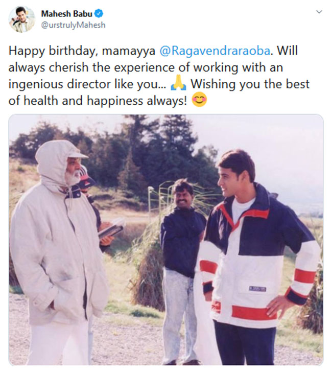 Mahesh Babu wrote, "Happy birthday, mamayya @Ragavendraraoba. Will always cherish the experience of working with an ingenious director like you... Wishing you the best of health and happiness always!" Referring to Raghavendra Rao as 'Mamayya' shows the close bond that they both share.