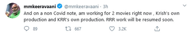 The ace Music Director Keeravani has tweeted saying that he is busy with two projects namely Director Krish and K Raghavendra Rao's. He also hinted that the work of RRR would begin soon this making the fans of NTR and Ram Charan happy with the latest update.