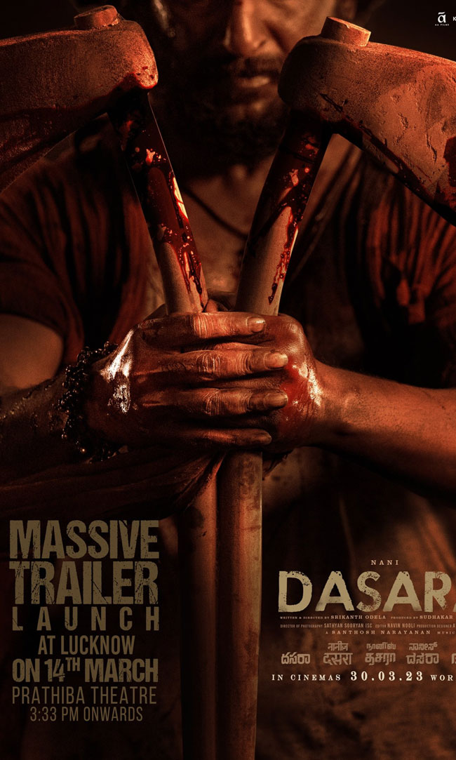 The makers have announced that the trailer will be coming out on 14th March and it has been reported that the grand trailer launch event will be held in Lucknow which is referred as 'Nawabo Ka Shahar'. The release time is fixed as 3:33 PM and the latest announcement poster is very chilling. He is seen holding two axes and the golden lighting enhances the mood amazingly. There is a lot of blood on his hands and the axe as well. Though Nani's face is not completely shown, we can easily see the aggression and the trailer is expected to be even more intense.
