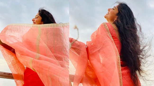 The actress is spotted in an orange coloured saree that further elevates Sai Pallav's natural beauty.