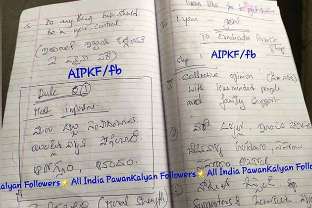 By: Tupaki Desk | 25 Sept 2016 4:27 PM ISTPictures of Pawan Kalyan with few fans at a Bengaluru Gym where is working out for getting into shape for 'Katamarayudu' were all over internet now. During the interaction, The Jana Sena Chief guided the group to go in the right path with few preachings. Some of them have been written by him on the notebook for future use. Have a look at themâ¦