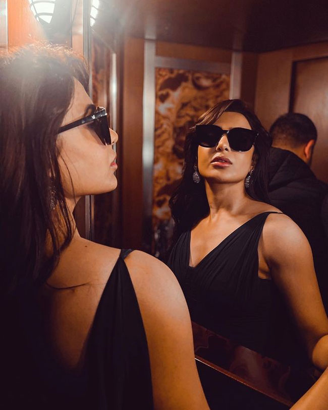 Dressed in a black outfit, Samantha looked super stylish while posing in front of the mirror. The glamorous diva has totally upped her style game and the shades she sported made her look even more appealing. For people who claim that the perfect look doesn't exist, this can be shown as an example as Sam just leaves you awestruck with her awesomeness.