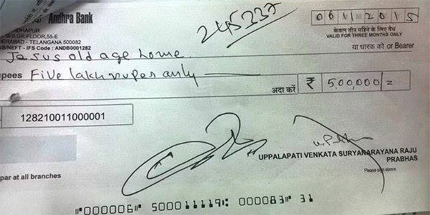 Reportedly, Prabhas donated Rs 5 lakh to Jesus Old Age Home in Hyderabad recently. Someone close to the Actor took a snap of the cheque and shared it online.