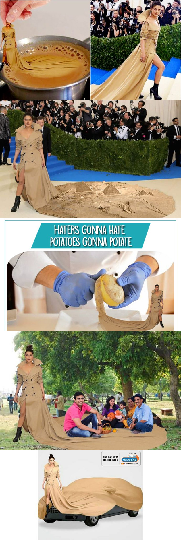 Desert and Egypt pyramids have been designed on the dress.. They made Priyanka a Tent Rider just like Tomb Rider.. Her dress is sown as a car cover.. Her dress used as a picnic blanket.. Her dress has been shown as a creamy layer on the tea.. Her dress also shown as peel of a potato.