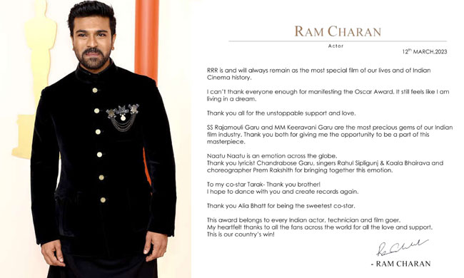 He adds, "SS Rajamouli Garu and MM Keeravani Garu are the most precious gems of our Indian film industry. Thank you both for giving me the opportunity to be a part of this masterpiece. 'Naatu Naatu' is an emotion across the globe. Thank you lyricist Chandrabose Garu, singers Rahul Sipligunj & Kaala Bhairava and choreographer Prem Rakshith for bringing together this emotion. To my co-star Tarak - Thank you brother! I hope to dance with you and create records again." He thanked the rest of the team and everyone for their love and support. He termed this as our country's win.