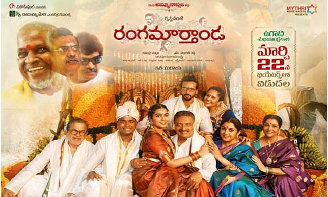 Produced by Houseful Movies and Rajashyamala Entertainments banners, Krishna Vamsi confirmed it as a story about all mothers and fathers. Legendary music composer Ilayaraja worked on the music while Sirivennela Seetharamasastry penned the lyrics. Versatile actor Prakash Raj is playing the title role. This movie is reportedly a remake of the Marathi film 'Nata Samrat' which has Nana Patekar playing the lead role. Krishna Vamsi who was once a top director in Tollywood has been struggling to make successful films over the past decade. Let us see how 'Rangamarthanda' turns out.