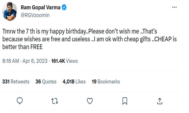 He informed everyone that the 7th of April is his birthday and said, "Tmrw the 7 th is my happy birthday..Please don't wish me ..That's because wishes are free and useless ..I am ok with cheap gifts ..CHEAP is better than FREE." As we know, RGV lives life on his own terms and says whatever he wants. He will definitely have a blast partying all day on his birthday but he did not leave a chance to gain the audience's attention with his latest tweet.