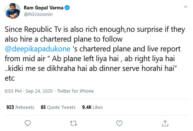 Now RGV has taken a jibe at a famous National Media Channel in a tweet that said.Since the media channel is rich it would now take a chartered flight like Deepika and find what she is having in Dinner and all nonsense minute by minute as it is a routine for the channel to do so he said!