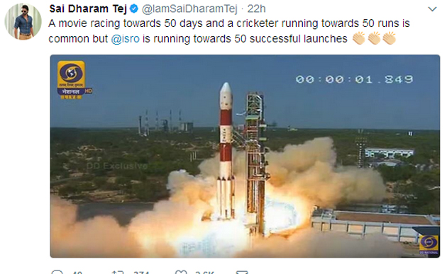 Well, going into the details, ISRO launched Cartosat-2 and 30 nano satellites into their orbit with launch vehicle PSLV C-38. The number 38 is significant here, it means ISRO has launch 38 missions with PSLV and Sai Dharam Tej praised this. He compared ISRO reaching the magic number of 50 launches with cricket and films.