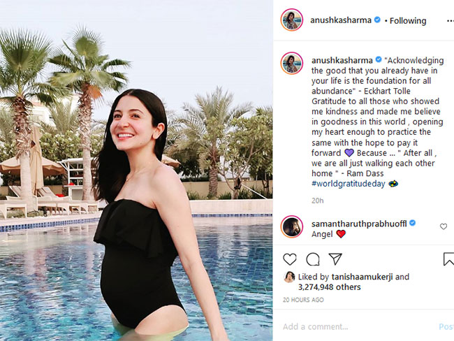 Now the actress has yet again showed her impeccable attitude on social media by commenting on a picture of Anushka Sharma who was in a bikini with baby bump. Samantha commented saying 'Angel'. It is evident that Anushka is enjoying her pregnancy and is all set deliver the baby in January 2021.