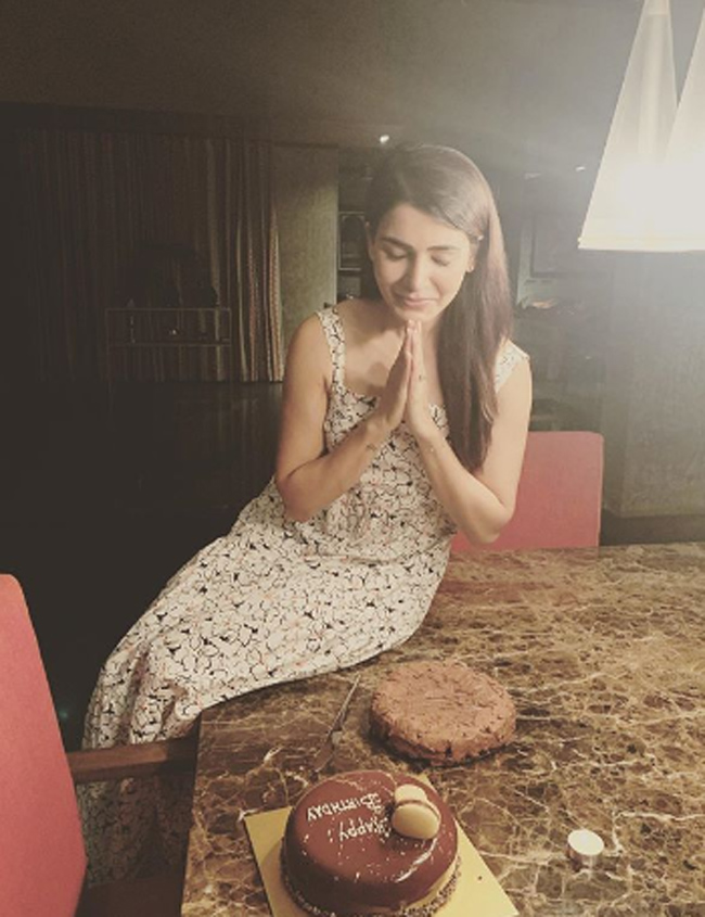 In the pictures, we can see Samantha praying and she is giving no points for guessing what she is praying for. There were two cakes in front of her, one cake is made by Naga Chaitanya and the other ordinary cake has 'Happy Birthday' written on it! She captioned the pictures, "Family.... (no points for guessing what I am praying for )."