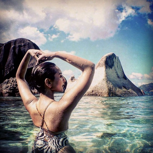 Currently holidaying in Seychelles, Sonakshi is making sure that none of her sexy pictures from the holiday will leak. Carefully she has chosen a picture where she engulfed in water half of her torso and shared it. But one could notice that she slipped into a single piece bikini as we could observe below waters.