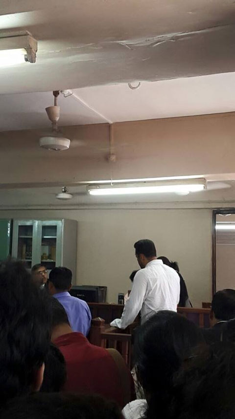 By: Tupaki Desk | 6 May 2015 4:00 PM IST By now it became a hot news in tinsel town that Salman Khan got convicted int he 2002 hit and run case and awarded 5 years imprisonment. As everyone is busy saying that Salman broke to tears after listening to court verdict, here comes a picture shot by a crowd in the court while the proceedings are going on.