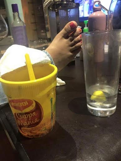 The other day RGV came up with a photo which raise eyebrows of the onlookers. RGV has uploaded a photo wherein a foot is being seen. Beside that photo there is an empty cup of Maggi noodles and a bottle of vodka.