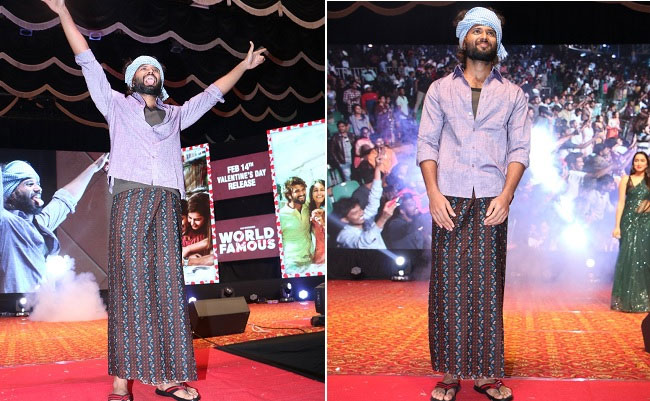 Tollywood's young sensation Vijay Devarakonda never leaves a chance to amaze us with his fashion sense. You cannot predict how he is going to dress up and his outfit at pre-release event of 'World Famous Lover' held in Vizag is another example.
