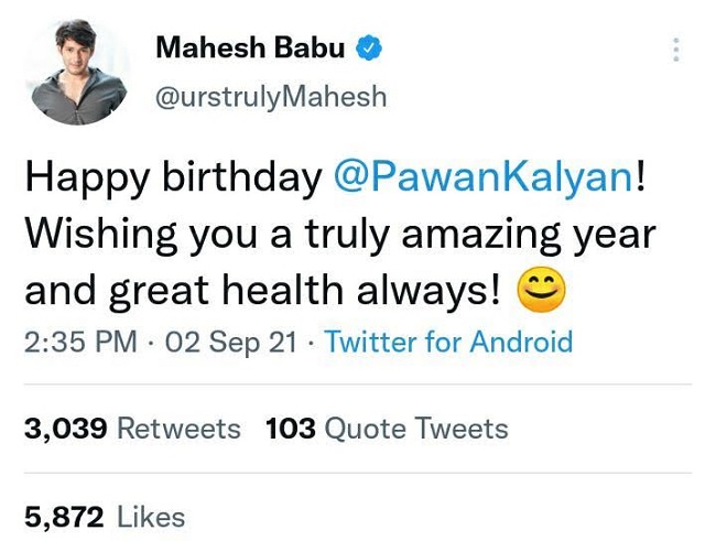 Mahesh Babu who is referred as superstar by everyone is active on social media and tweets on every hero's birthday. Today, he took to Twitter and wrote, âHappy birthday @PawanKalyan! Wishing you a truly mazing year and great health always!â Pawan Kalyan and Mahesh Babu might not be close friends but have mutual respect over each other. Pawan stood by Mahesh's side during the piracy of 'Arjun' back 2004-05 and Mahesh gave voiceover for Pawan's 'Jalsa'.