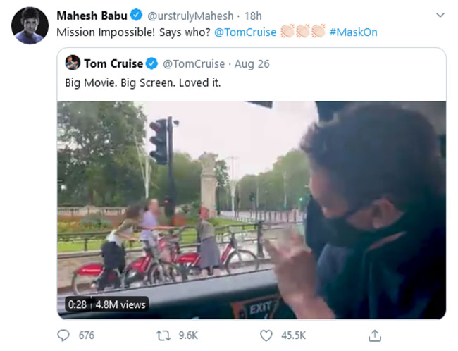 On the latest the Superstar tweeted about Hollywood star actor Tom Cruise watching Tenet movie in an Imax theater after reopening the theaters in this corona crisis time. Mahesh has rooted in cheers for the rreviving of film business slowly!