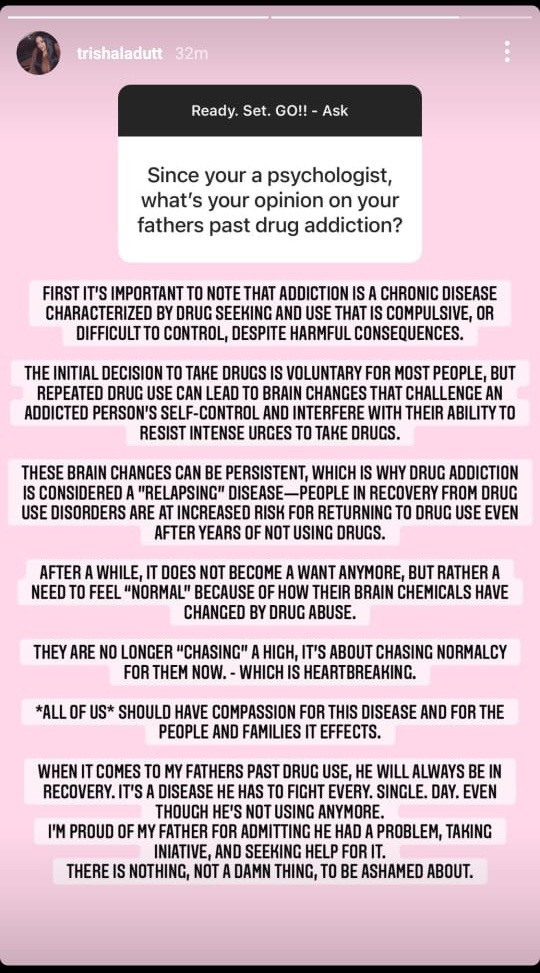 She told, "For my father about his past drug use, he will always be in recovery. It's a disease he has to fight every single day, even though he is not using it anymore. I am proud of my father for admitting he had a problem, taking initiative and seeking help for it. There is nothing, not a damn thing, to be ashamed about."