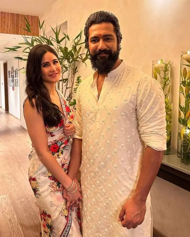 Vicky Kaushal and Katrina Kaif chose a unified white theme, with Katrina donning a vibrant floral saree, complemented by Vicky's stylish white chikankari kurta set. Their minimalistic approach to makeup and accessories added to the festive charm.