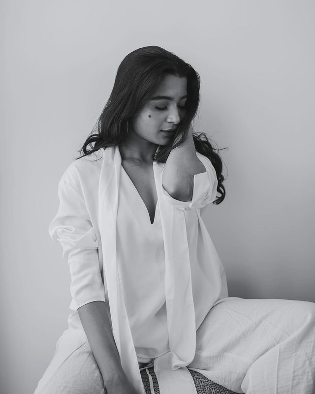 Recognized for her remarkable acting skills, Chaithra often graces the screen in a signature white ensemble, showcasing her free-spirited style. Recently, she shared a captivating photo with the caption, "If it all was as simple as black and white…" credited to photographer Nithish Ayyod, styled by Aishwarya, and makeup by Niriksha MUA.