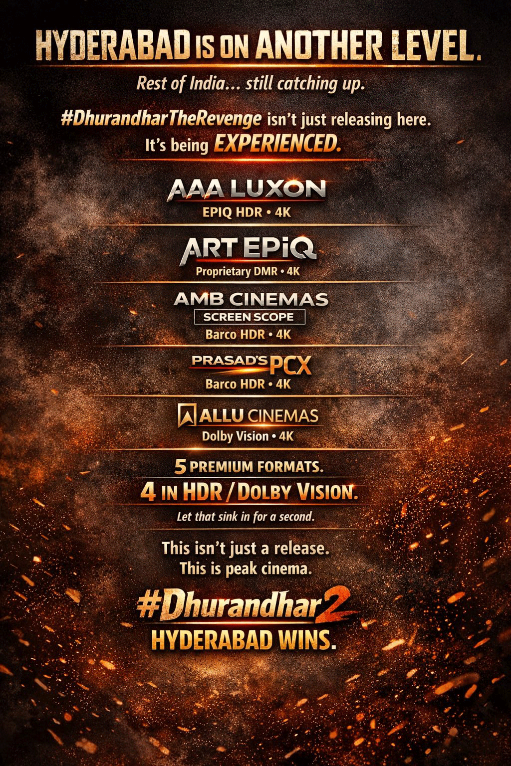 Needless to say, these five theatres have just set the tone for ultimate viewing experiences in the whole of India, while most of the theatres in Mumbai, Delhi, Bengaluru and Chennai are still running with Barco 2K projection systems and Dolby Atmos sound. That means Hyderabad city has something to offer that no other Indian city has, and it's high time that this city becomes the capital of Indian cinema. Currently, these screens are showcasing Dhurandhar 2, and many film connoisseurs are coming from corners of the country to catch up on this epic movie on these screens.