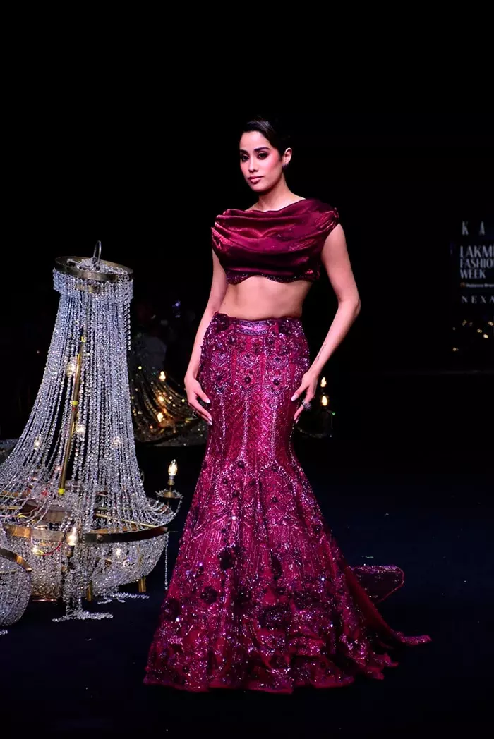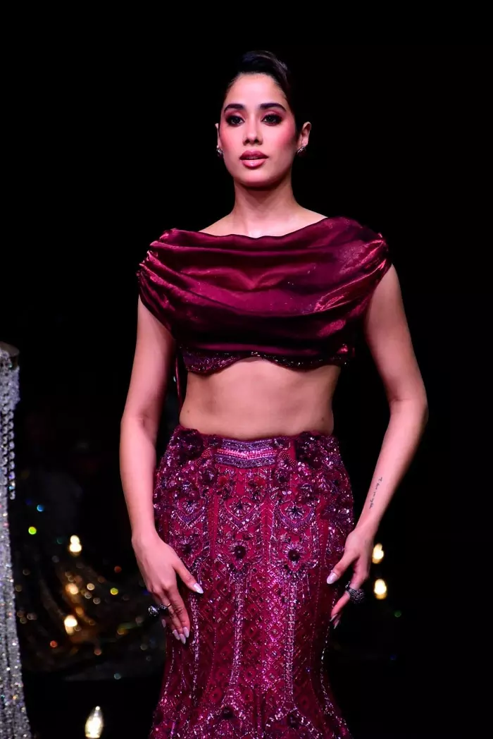 By: Tupaki Desk | 18 March 2024 10:05 AM ISTJanhvi Kapoor is known for her impeccable sense of style, and she proved it once again at the recent Lakme night. Dressed in a stunning red wine satin top and midi skirt, paired with a chic bun hairstyle and elegant ear studs, Janhvi's look was nothing short of perfection. Her makeup, with its adorable touches, complemented the ensemble beautifully.
