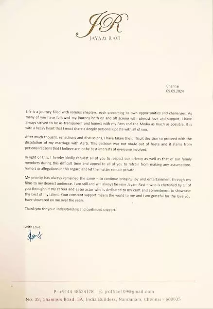 He says that his main priority right now is to continue bringing joy and entertainment through my films to his dearest audience. He went on to say, “I am still and will always be your Jayam Ravi - who is cherished by all of you throughout my career and as an actor who is dedicated to my craft and commitment to showcase the best of my talent. Your constant support means the world to me and I am grateful for the love you have showered on me over the years. Thank you for your understanding and continued support.”