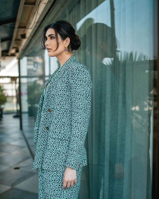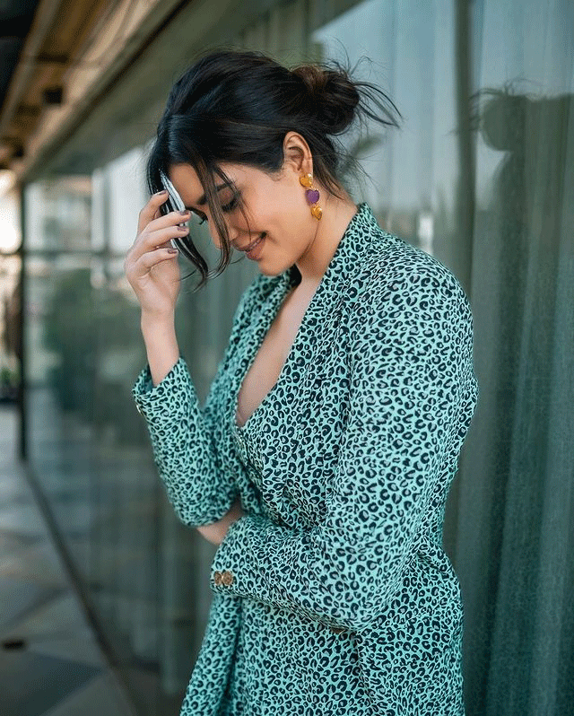 Beyond the screen, Karishma Tanna's recent Instagram posts have caught attention, showcasing her in a stylish cheetah design outfit with unique accessories, a chic bun hairstyle, and a captivating smile, creating a buzz among her fans.