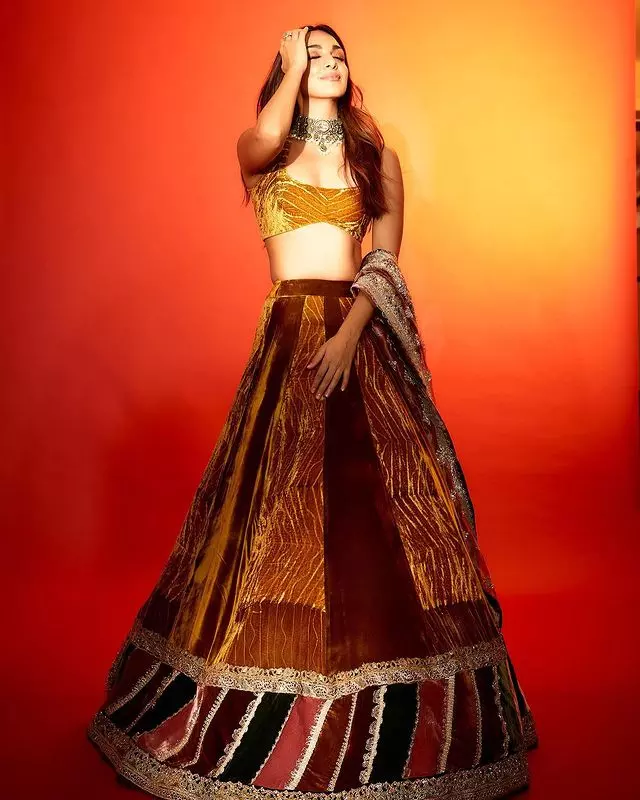Kiara effortlessly rocked a radiant mustard lehenga set designed by the host of the event, none other than the renowned fashion guru, Manish Malhotra himself. Her chic velvet attire was so striking that it dominated fashion headlines. The diva's lehenga skirt featured a vibrant multicolored pattern, accentuated by exquisite gota patti work along the hemline. Adding a touch of modernity to her traditional outfit, Kiara donned a deep-neck cropped bustier that exuded edginess. Her beautifully draped pink-hued dupatta, adorned with gold embellishments, provided a captivating contrast to the ensemble.