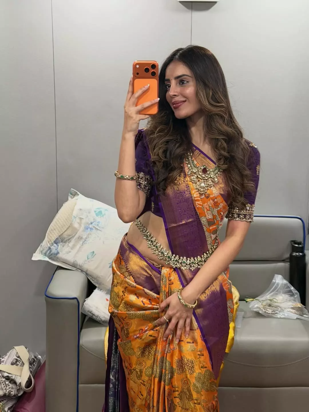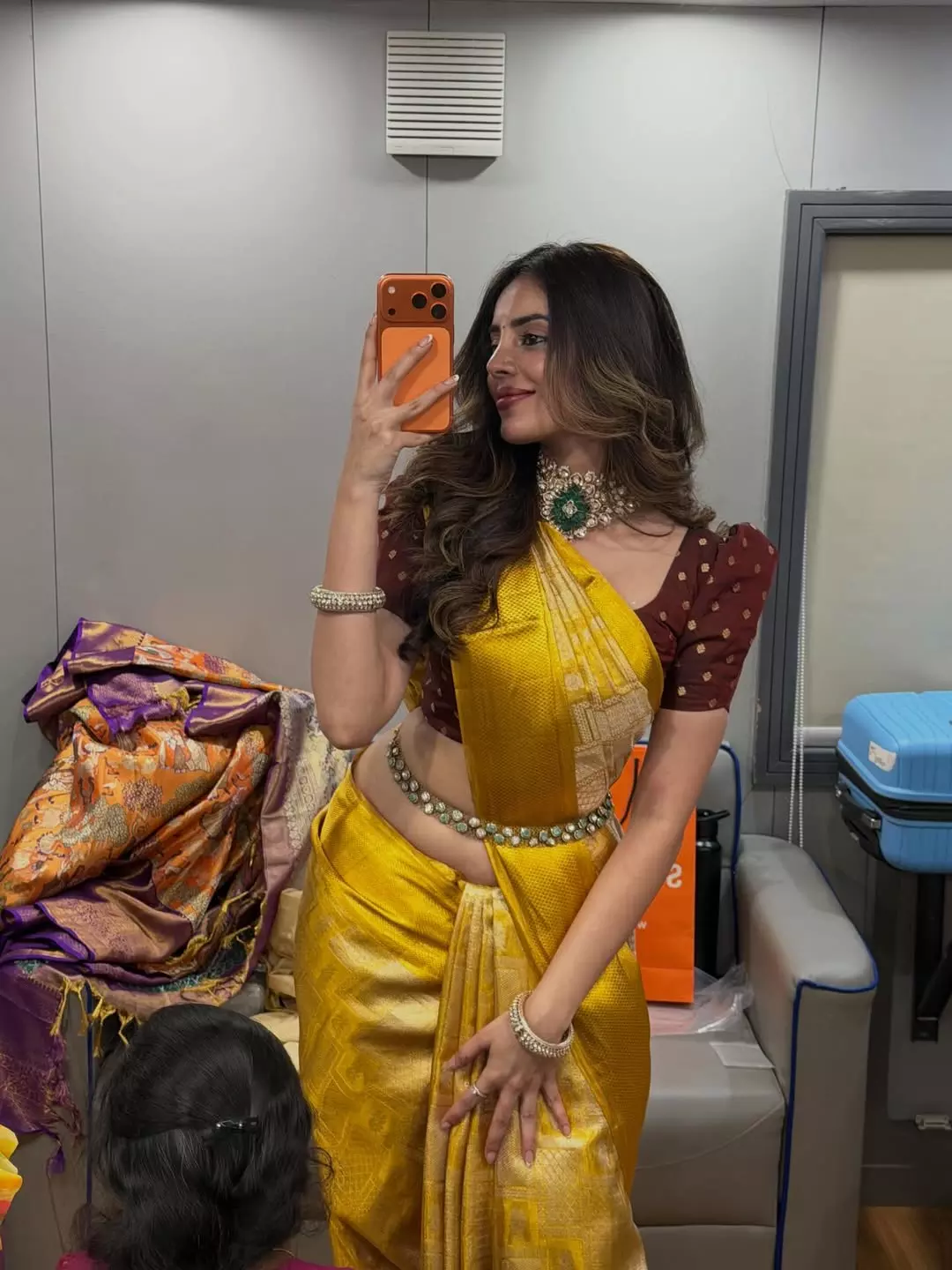 She has turned into a complete South Indian girl by wearing all silk sarees with matching designer blouse and heavy jewelry from chokar to midriff chains and bangles. By seeing her this beautiful, anyone will immediately feel like buying the outfits instantly. Definitely doing this kind of marketing makes sense to the clothing brands.