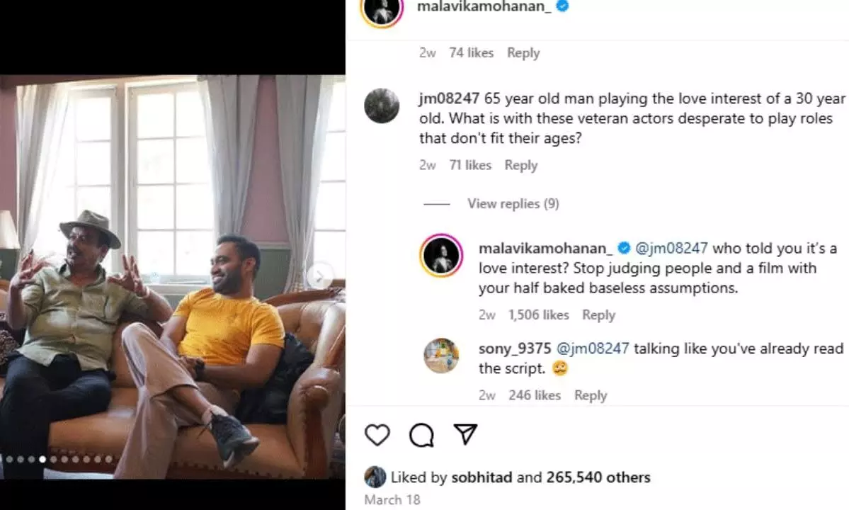 Recently, a fan questioned Malavika in a sharp comment online: “Why is a 65-year-old man playing the love interest of a 30-year-old? Why are these veteran actors desperate for roles that don’t suit their age?” Malavika didn’t hold back. She hit back saying, “Who told you it’s a love interest? Stop judging people and a film with your half-baked, baseless assumptions.” Her unapologetic and bold reply instantly went viral, sparking widespread discussion across the industry.